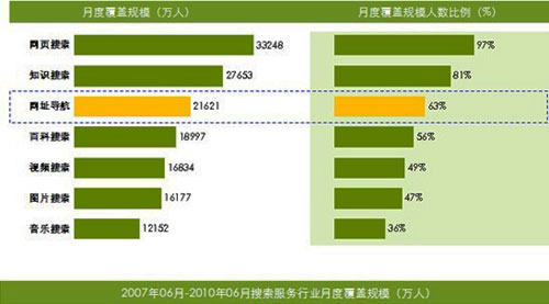 2010年艾瑞互联网行业研究报告显示,搜索服务行业中,从月度覆盖规模上来看网站导航行业(21,621万人)排第三位,仅次于网站搜索和知识搜索。2007年到2010年三年,整个搜索服务行业月度覆盖规模上呈增长状态,其中网址导航行业三年内增长幅度高达246%,是整个搜索服务行业中三年内提升幅度最大的。