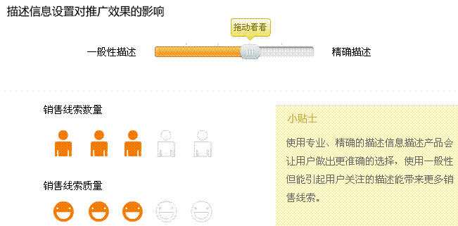 使用专业、精确的描述信息描述产品会让用户做出更准确的选择,使用一般性但能引起用户关注的描述能带来更多销售线索。